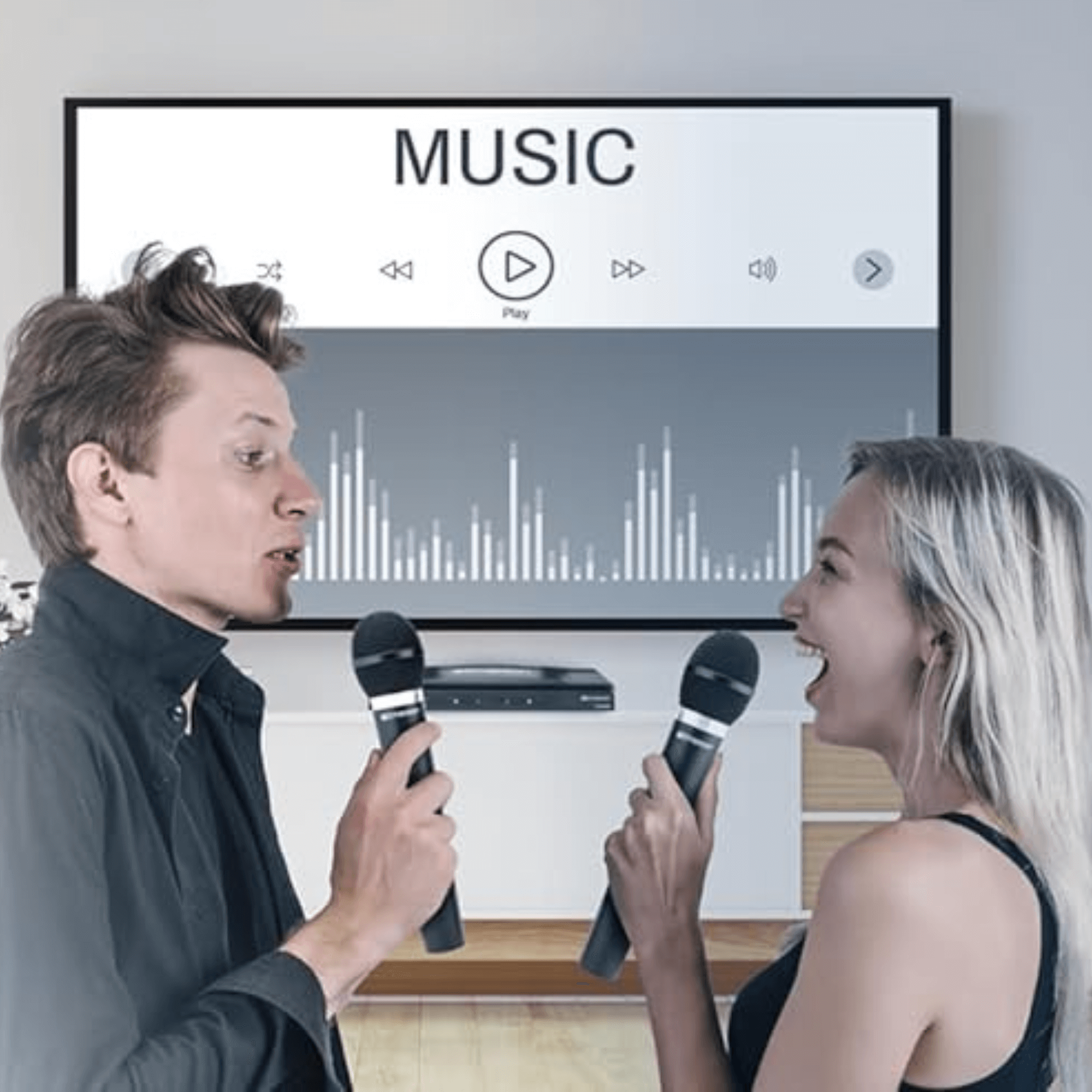 An easy-to-use dual wireless microphone starter set from Emerson™ includes two handheld wireless microphones and a wireless FM receiver, giving you the range and enhanced mobility you need up to 30 feet in a good position. This microphone system is perfect for almost any occasion, from karaoke or corporate events to speeches or ceremonies.