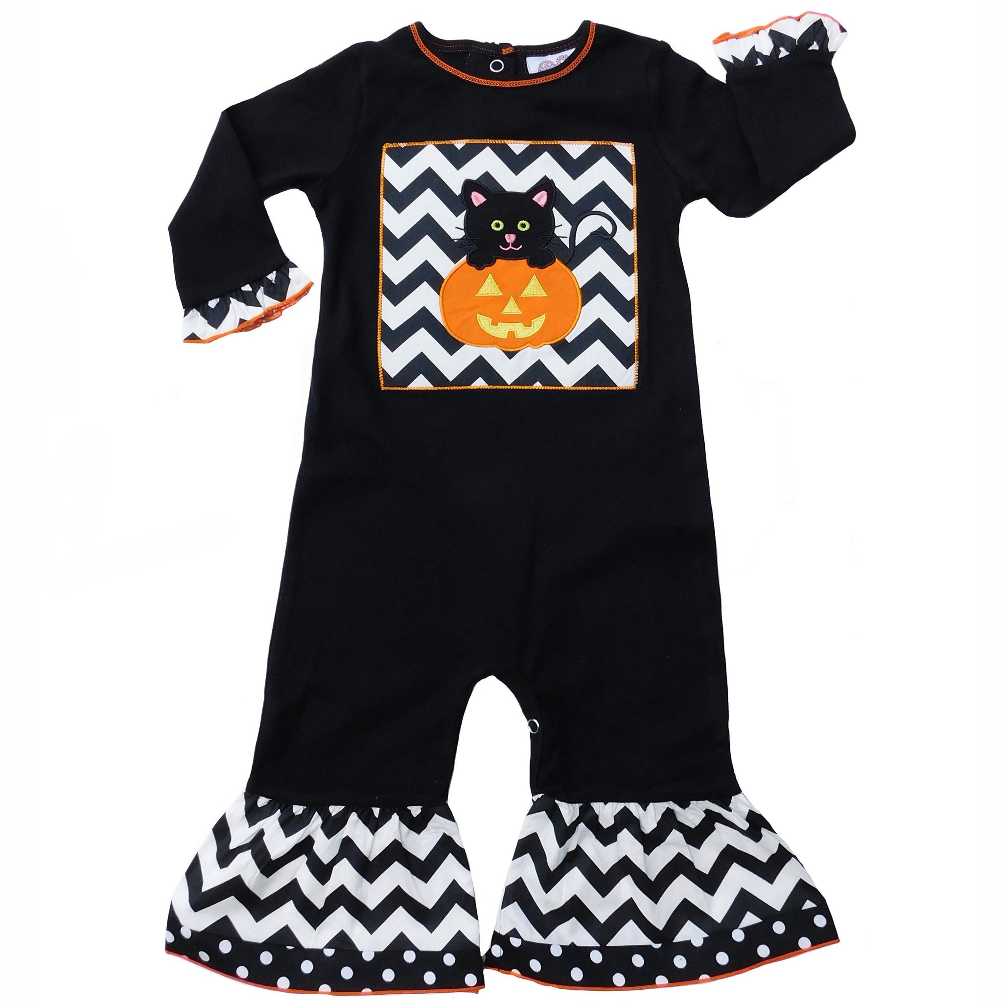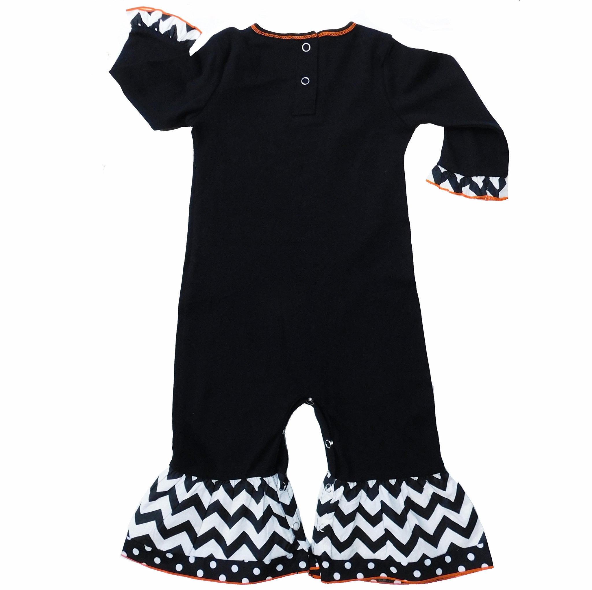 Boutique Baby Girls Halloween Romper. Romper features Black Cat in a Pumpkin embroidered patch applique lovely chevron ruffles. Black knit cotton romper boasts snaps behind the neck and in crotch for easy on and off. Made with 100% Cotton.