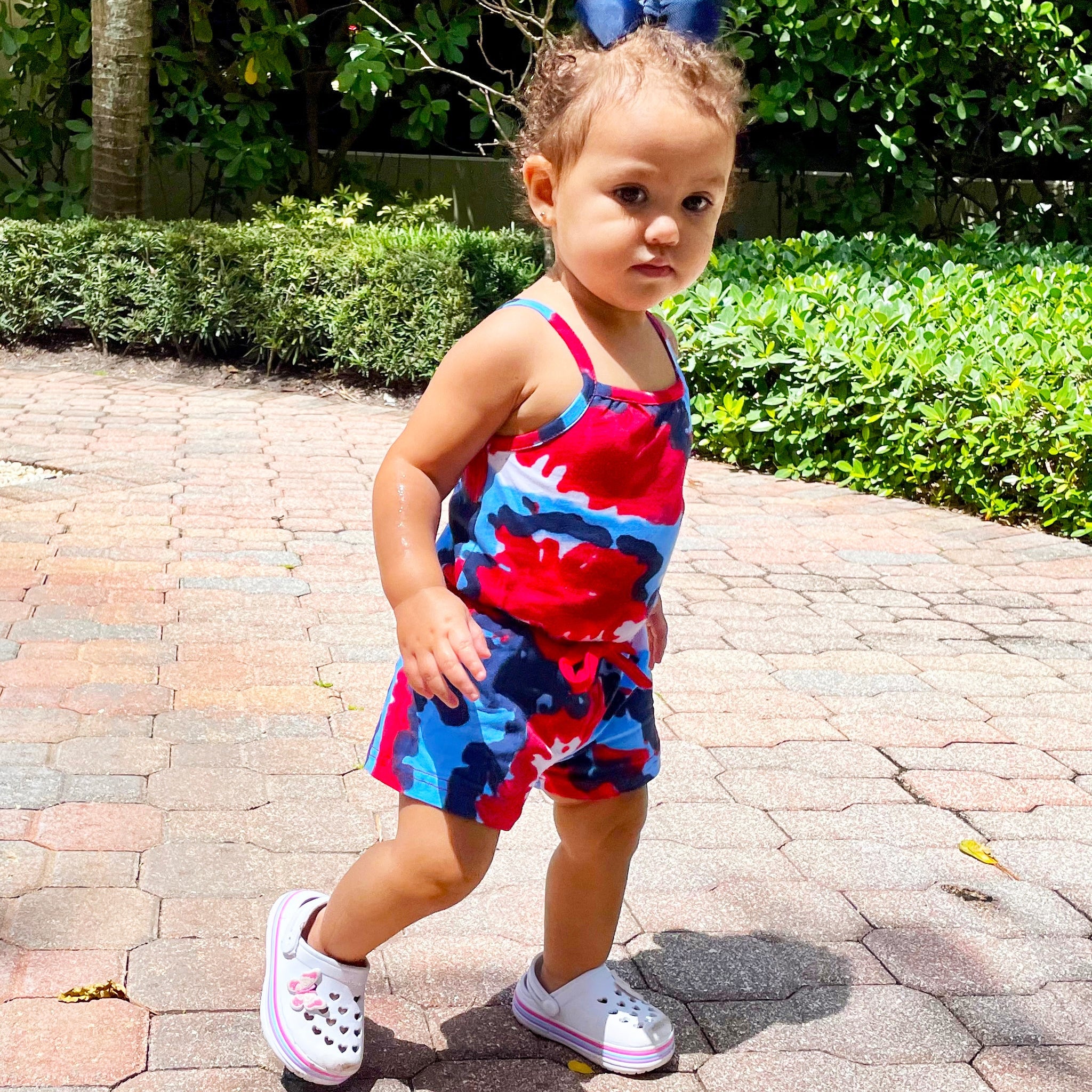 AnnLoren perfect fashion forward big girl tween and little girls style jumpsuit. Trendy & comfortable rompers with POCKETS for any season and occasion. Soft Cotton Red, White & Blue 4th of July Tye Dye print. Elastic waist line with bow at center. Very flattering and comfortable.  Easy on and Off. Just step in and pull up. Made with 97% Cotton 3% Lycra stretch knit. Machine Washable. Designed int he US by 2 moms, made in China.