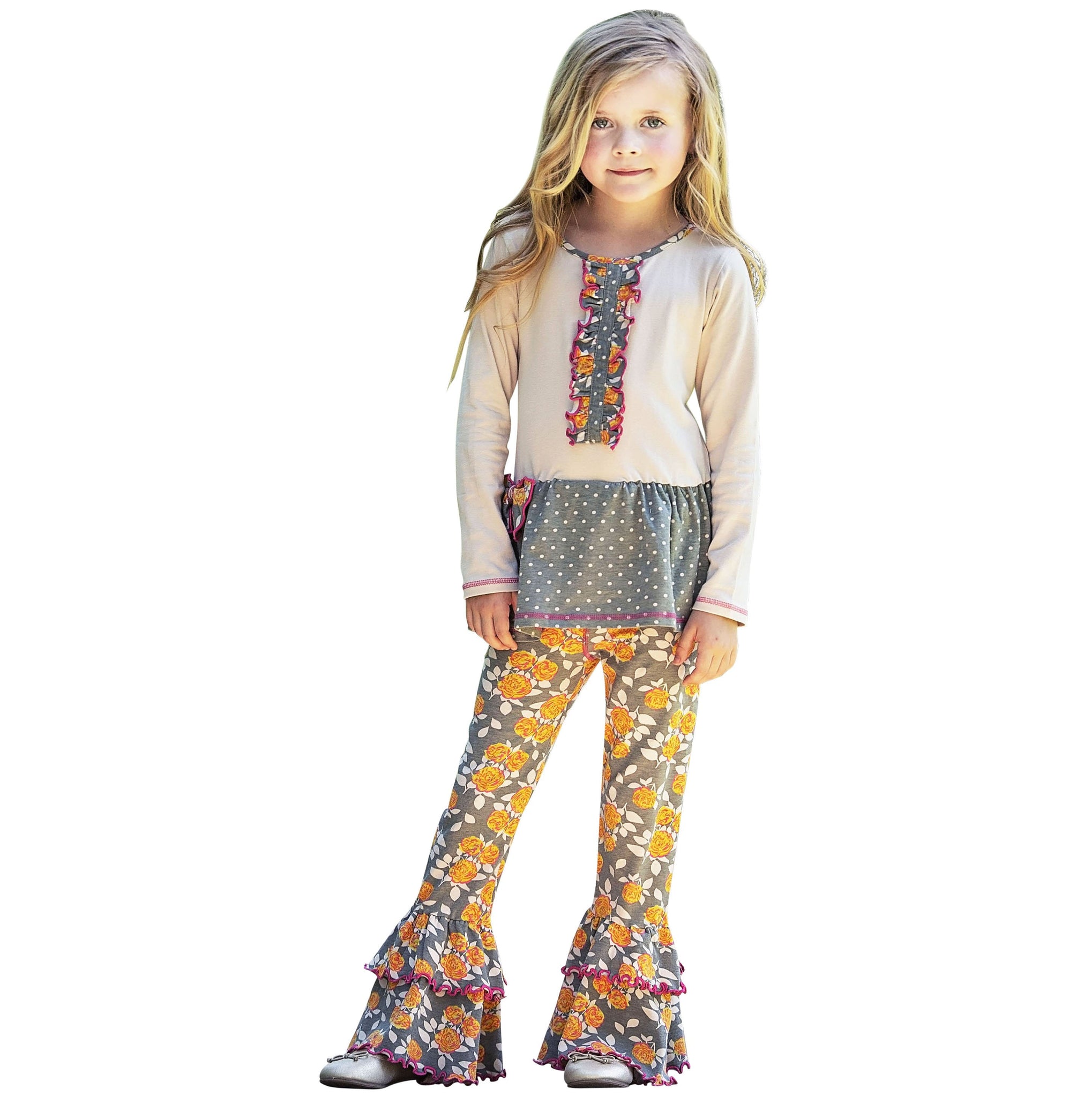 AnnLoren Original Jersey Knit Long Sleeve Cotton Tunic, finished with a floral Tux ruffle design, and accented with a Polka dot skirt and bow applique. Features Long floral pants with ruffles and an elastic waistband for a comfortable fit. Made with 95% Cotton/5% spandex and Machine Washable.