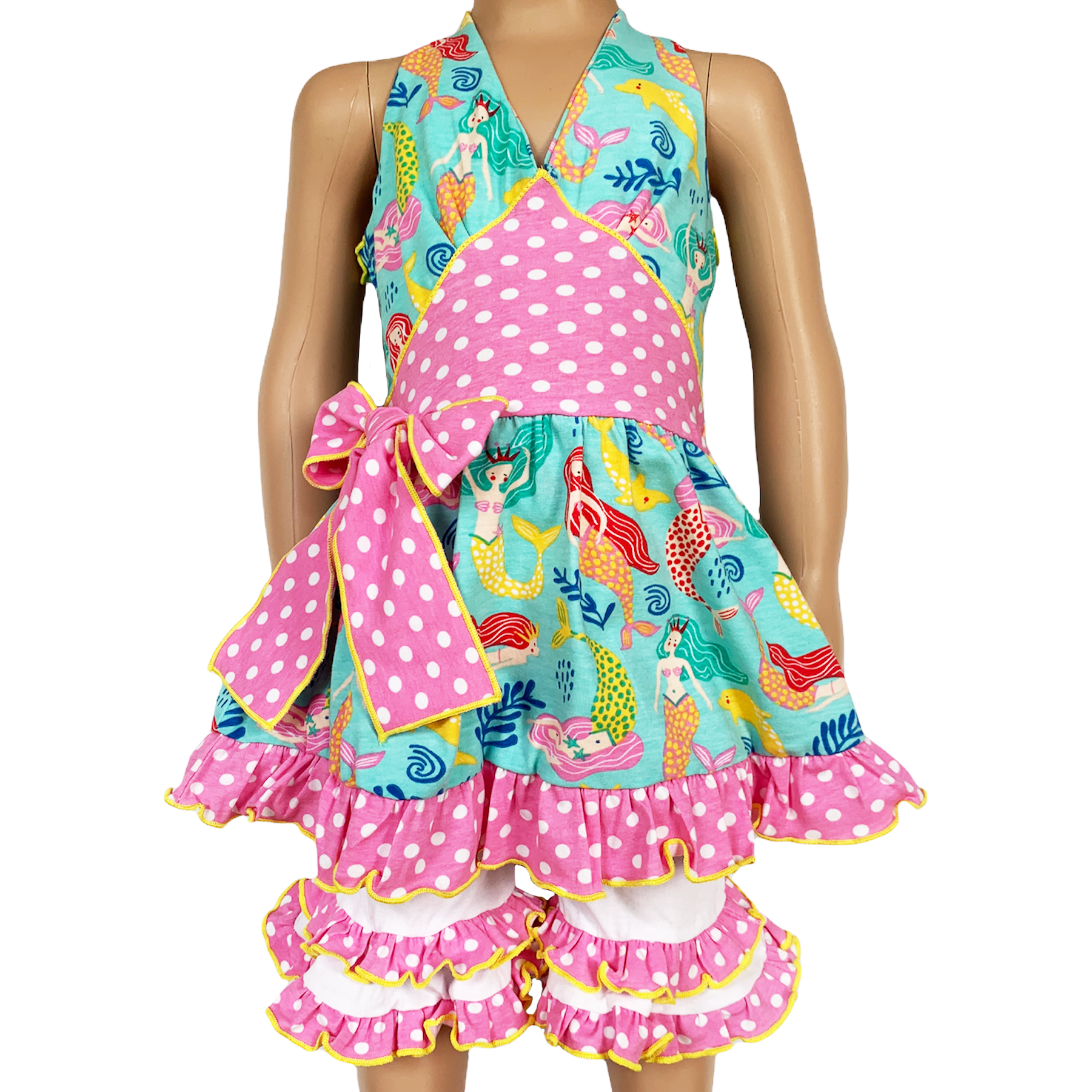 AnnLoren Girls Mermaid Halter Dress & White Ruffle Shorts Boutique Set