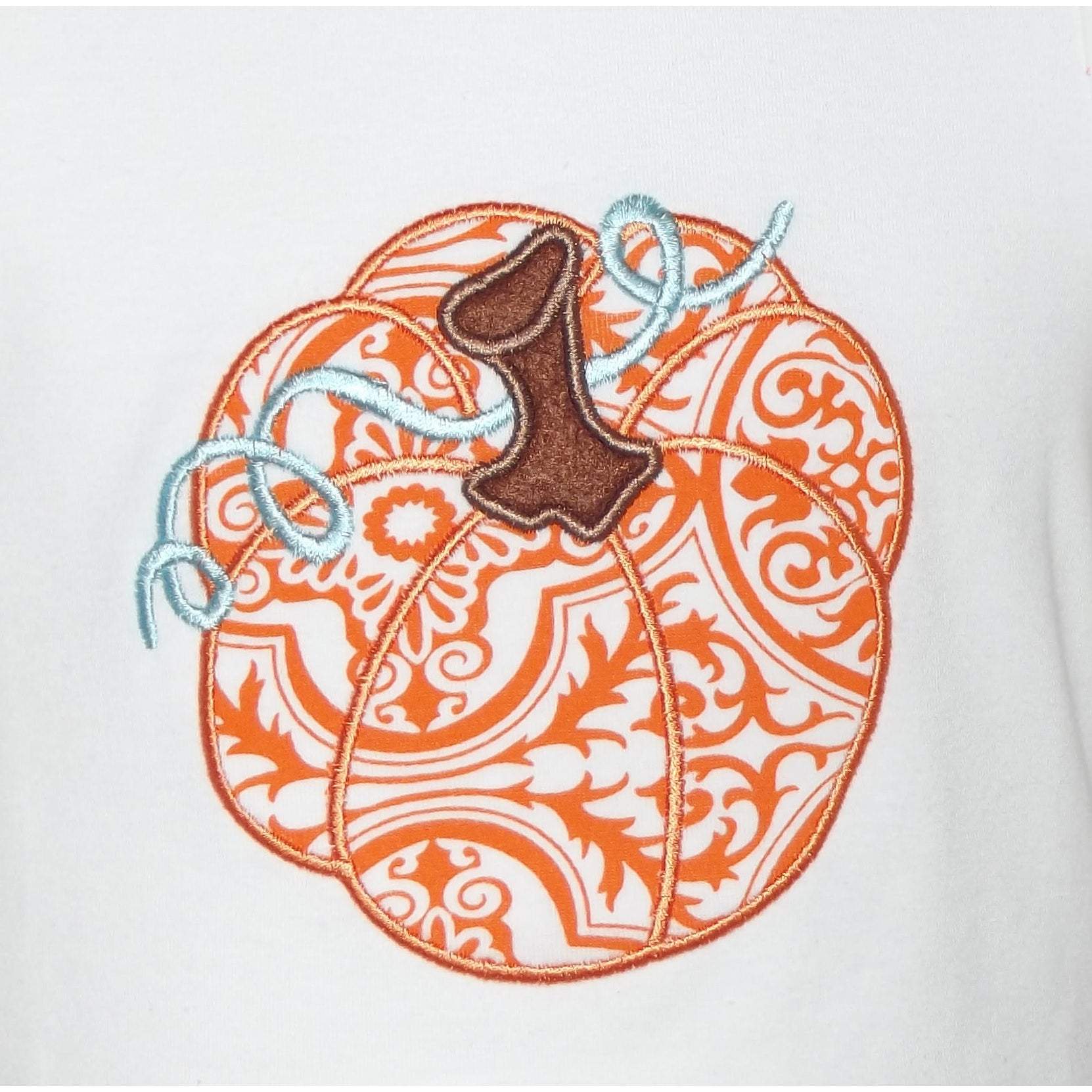 AnnLoren 2 piece Autumn set. Boasts Cream long sleeve knit shirt with Orange Pumpkin embroidered patch and orange damask ruffle. Autumn floral knit pants with ruffled bottom. Features an Elastic waist band for a comfortable fit.