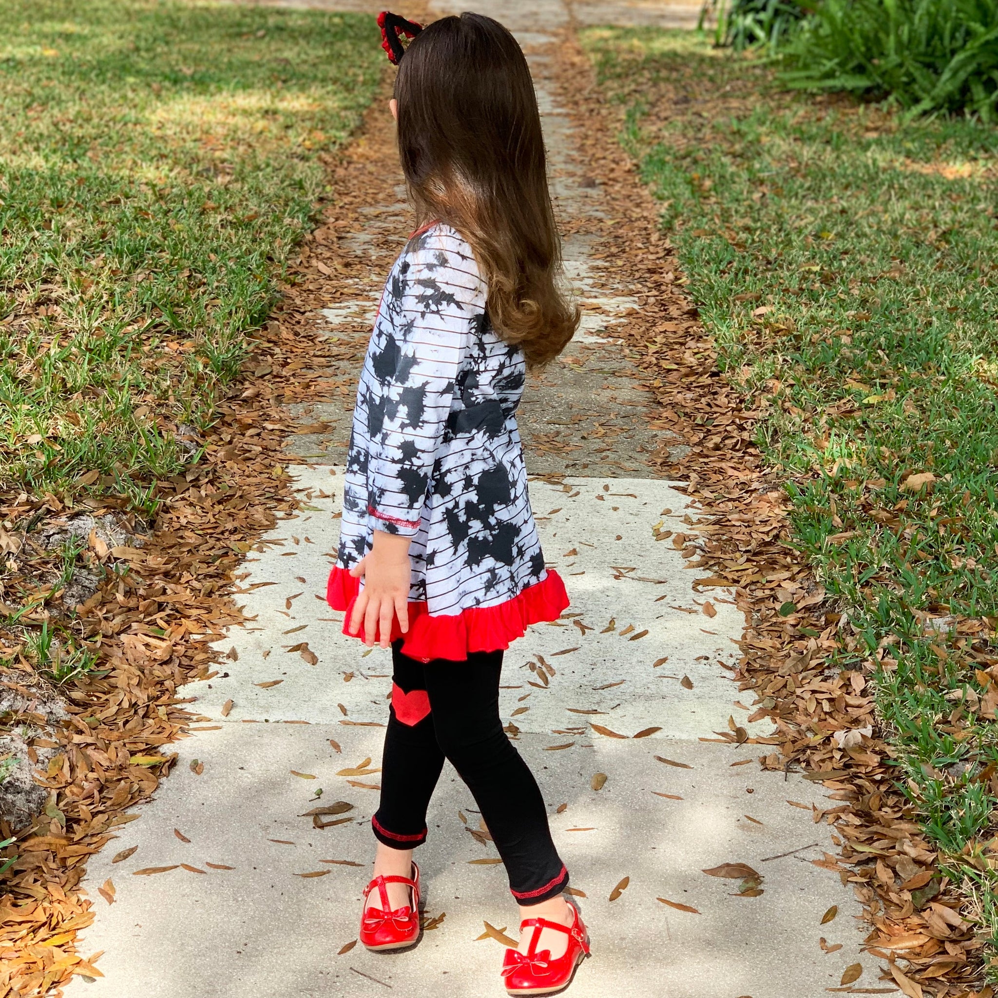 Trendy Black and White Tie Dye Dress with Big Red Heart LOVE patch applique. Trimmed with red ruffle. Black leggings with red stitching trim and red heart patch on the knee.  97% Cotton/3% Spandex. Machine Wash and Hang Dry for best care.